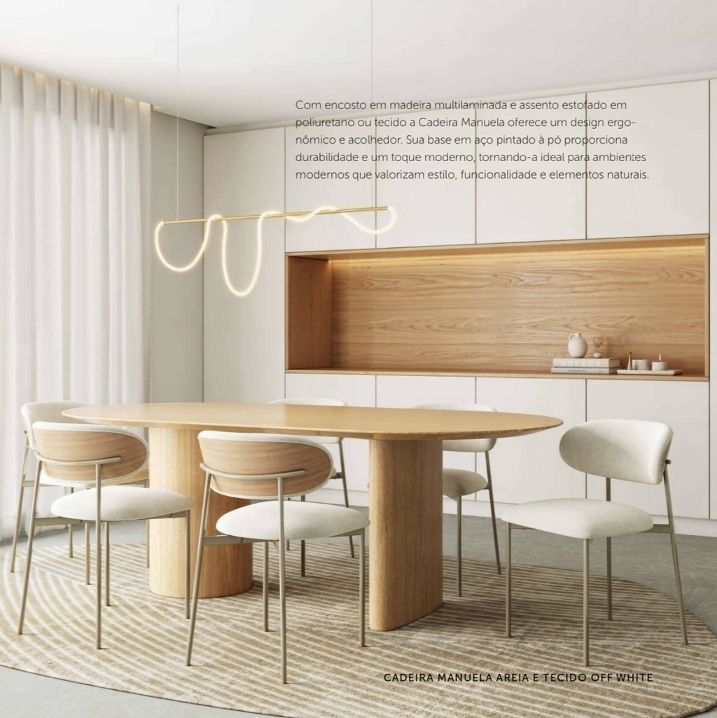 O Conjunto 4 Cadeiras Manuela é a escolha perfeita para quem busca sofisticação e durabilidade em móveis modernos. Seu design elegante destaca-se em qualquer ambiente, proporcionando um toque acolhedor e contemporâneo que transforma o espaço.