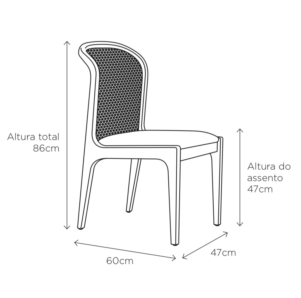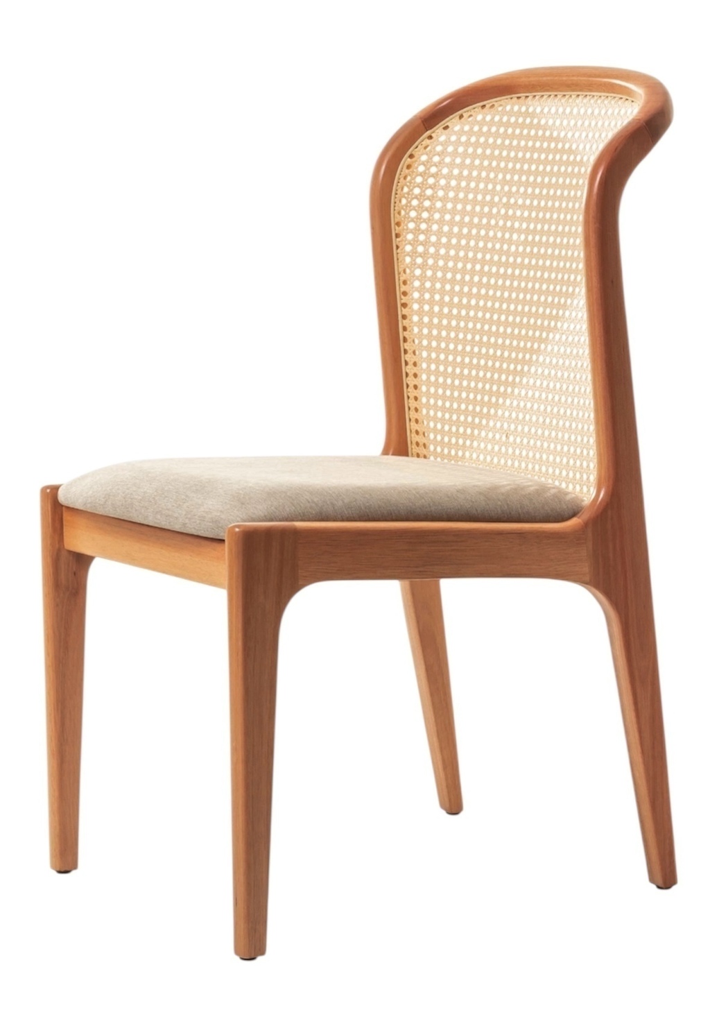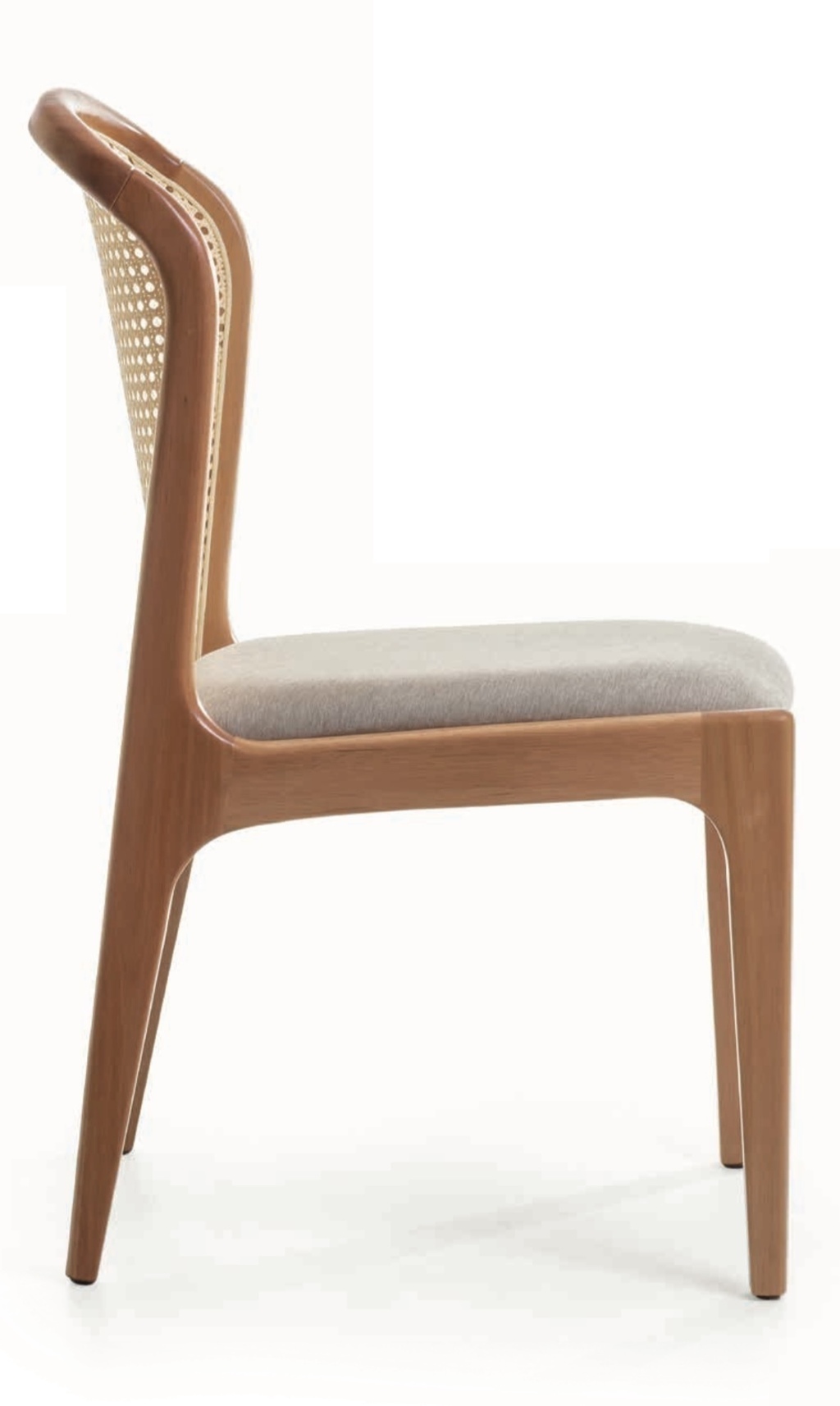 O assento utiliza compensado de pinus naval de 12mm, reconhecido pela resistência à umidade, enquanto o encosto é uma perfeita combinação de madeira com rattan, proporcionando um visual elegante e aconchegante.