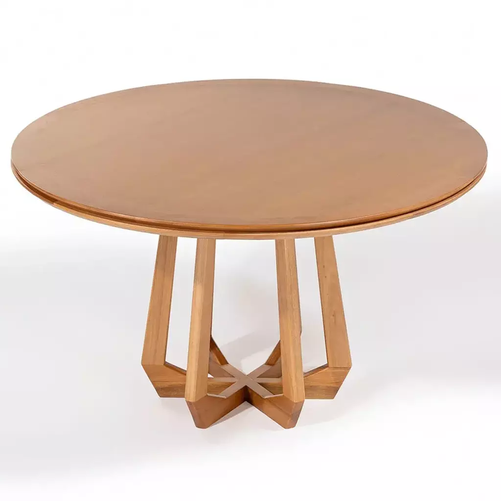 Com design acolhedor e presença marcante, a Mesa Redonda Quézia é a escolha ideal para quem busca funcionalidade com estilo. Seu tampo redondo em MDF laminado possui acabamento em verniz mel, que valoriza os veios naturais da madeira e traz um toque de sofisticação ao ambiente.O grande destaque da peça está na sua base robusta em formato de estrela, um desenho geométrico que combina leveza visual com excelente estabilidade. Fabricada em madeira tauari, essa base garante firmeza e durabilidade para o dia a dia.Com 130cm de diâmetro.